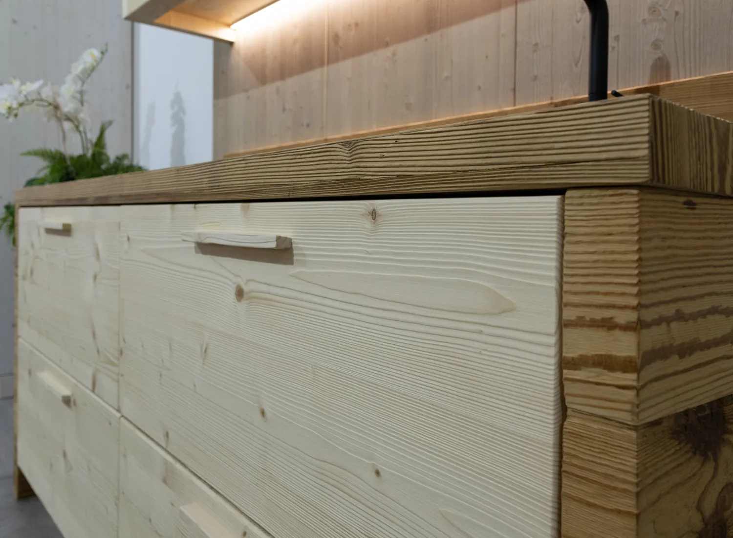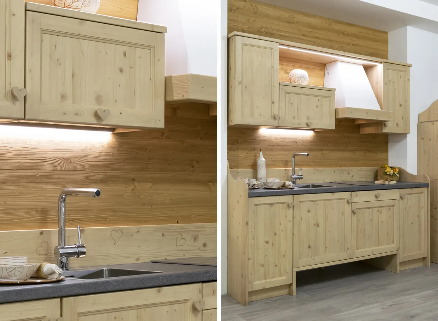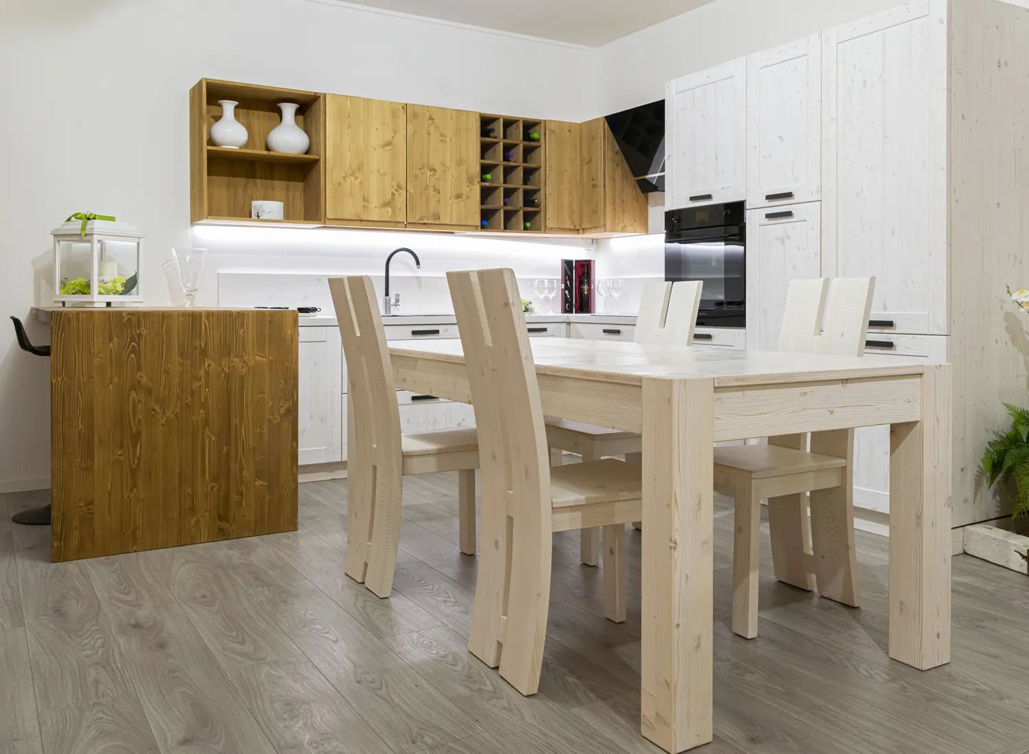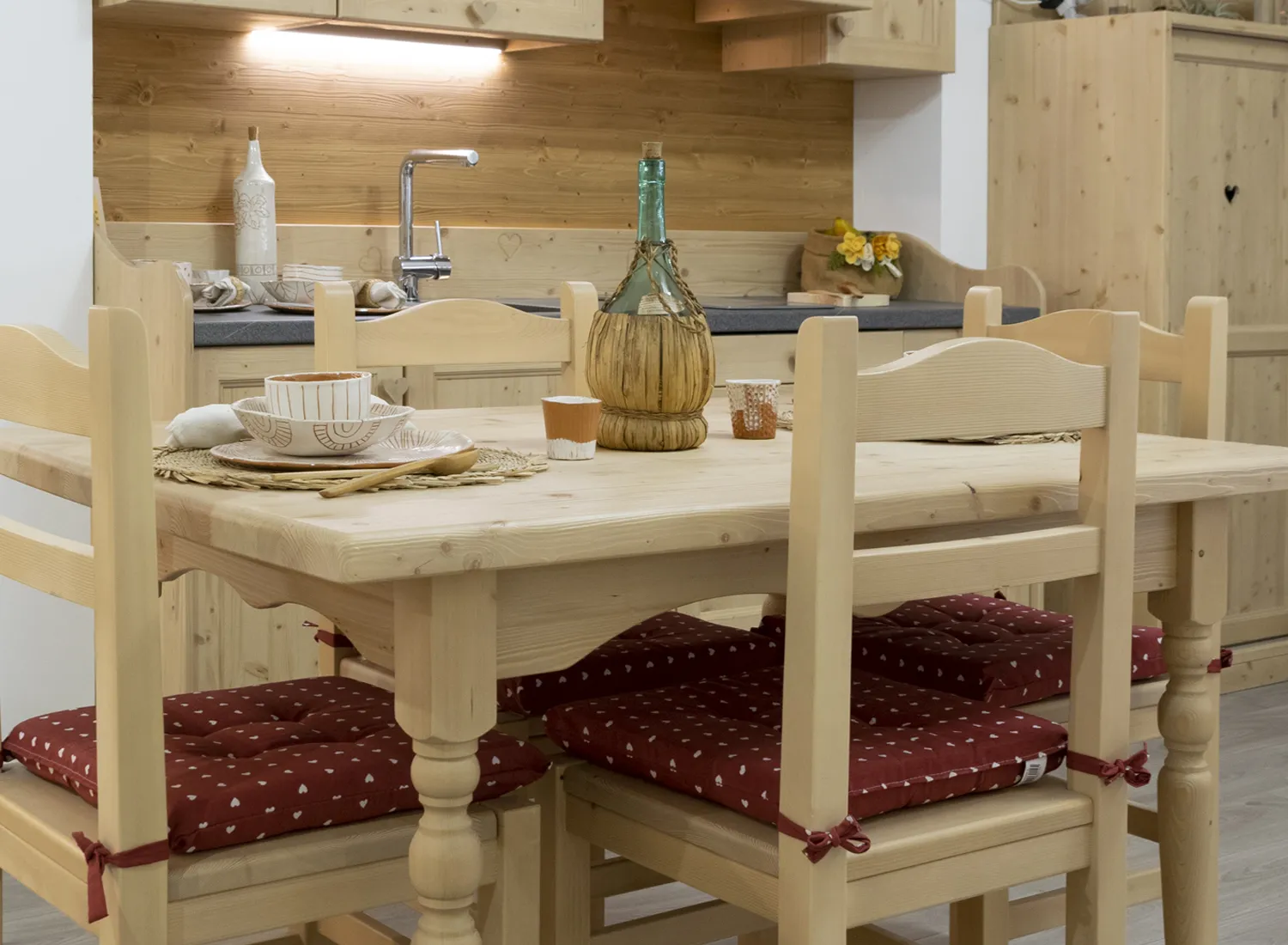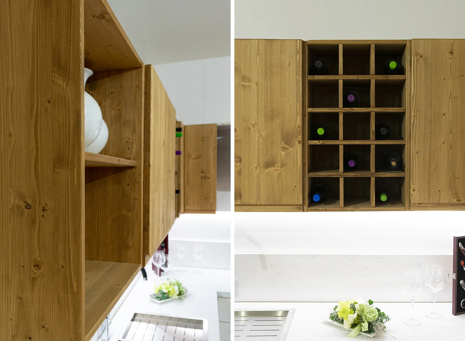 Le varie colorazioni, le tipologie, e i numerosi modelli di cucina in abete massello permettono di creare fantastici giochi di linee e di luce, che si integrano perfettamente con le composizioni create.