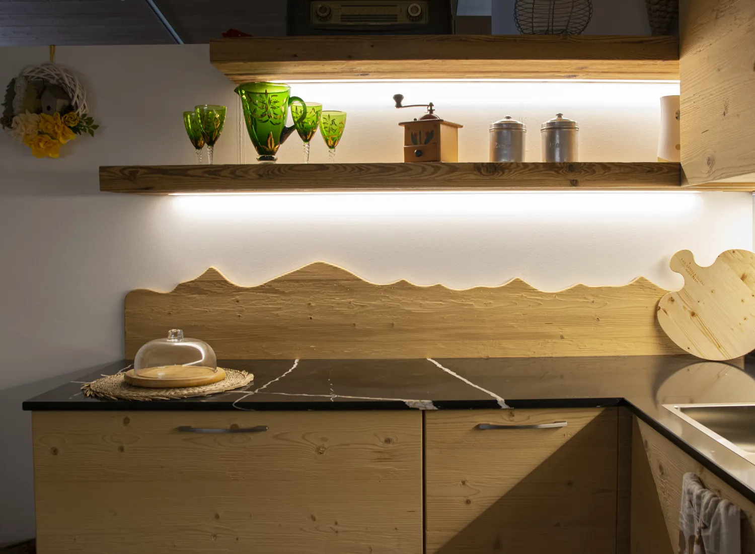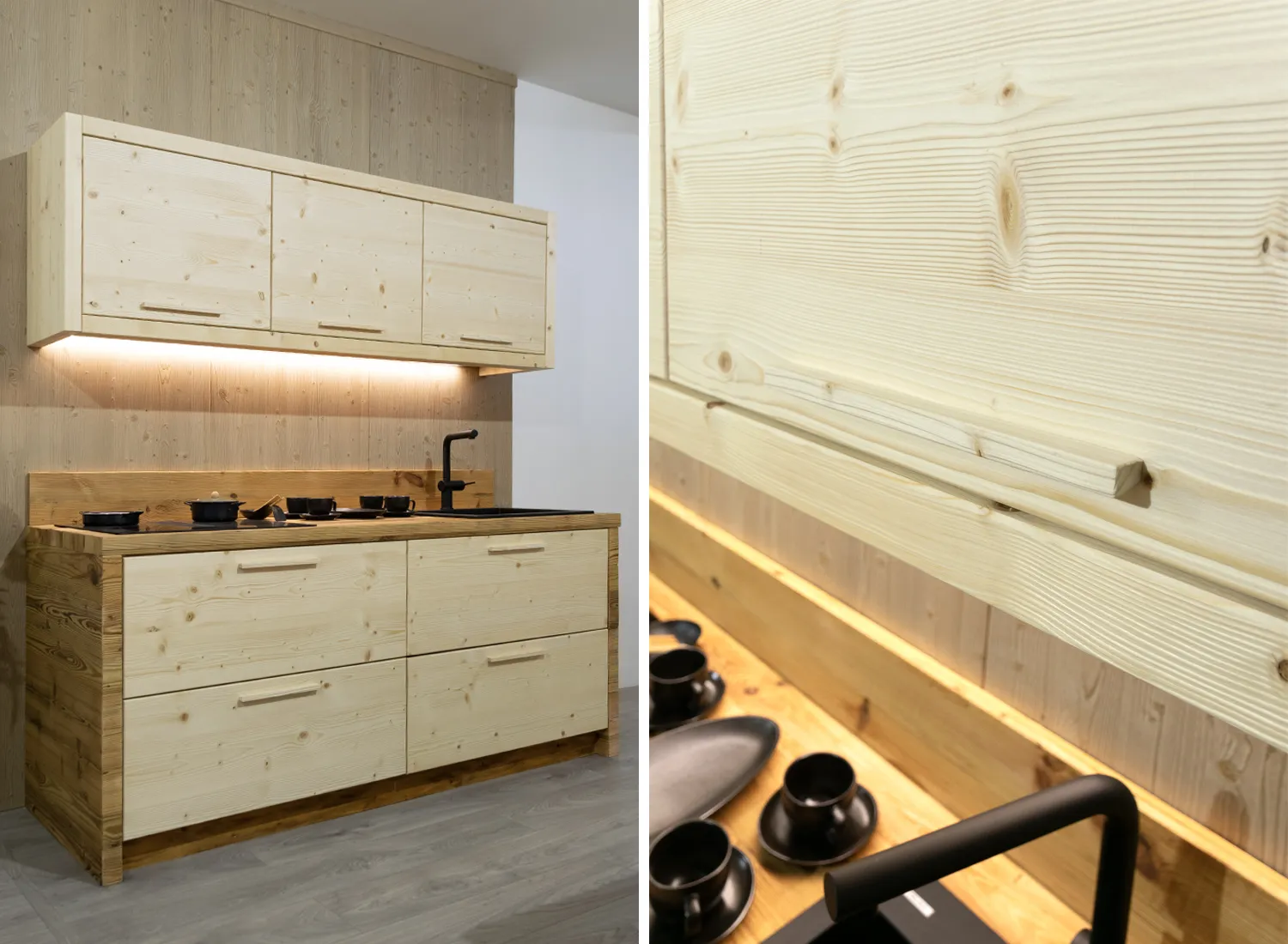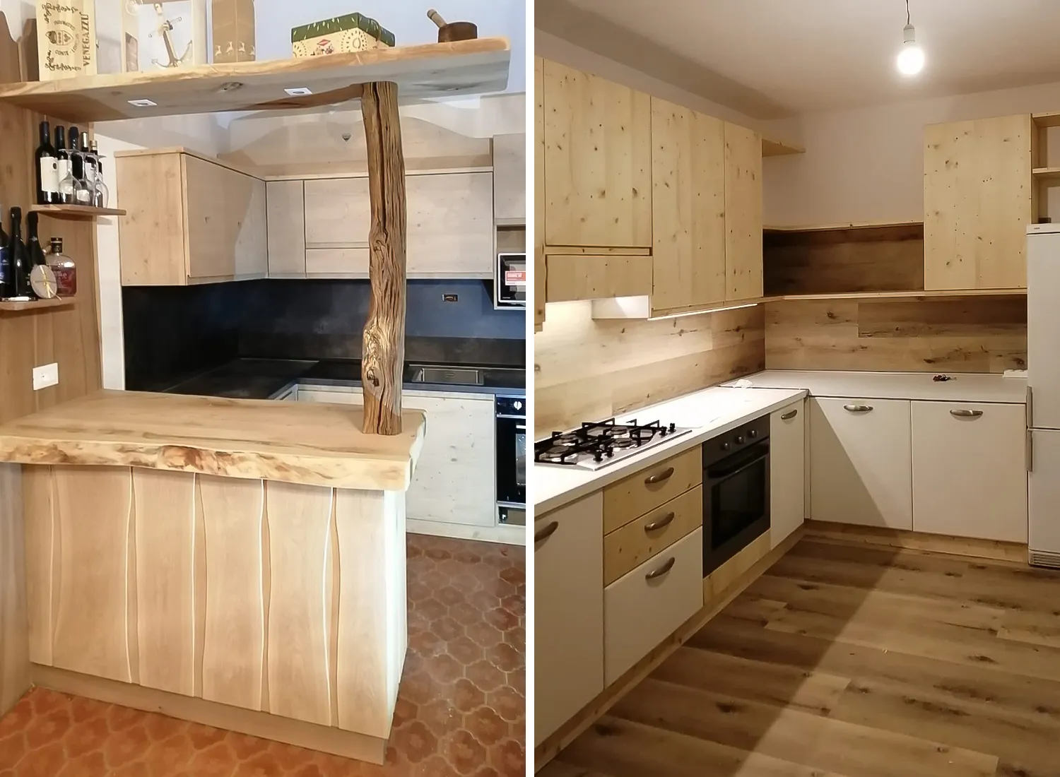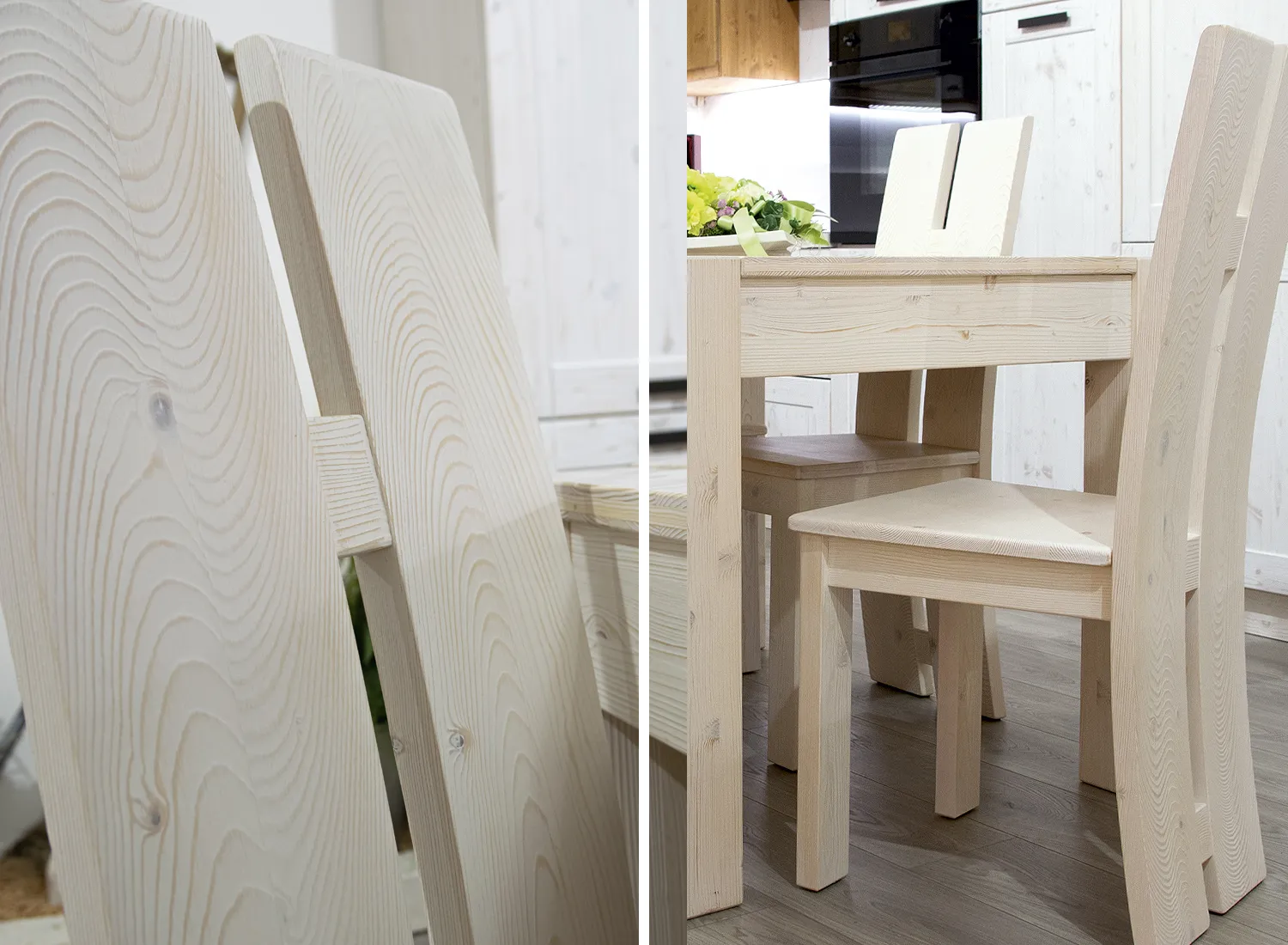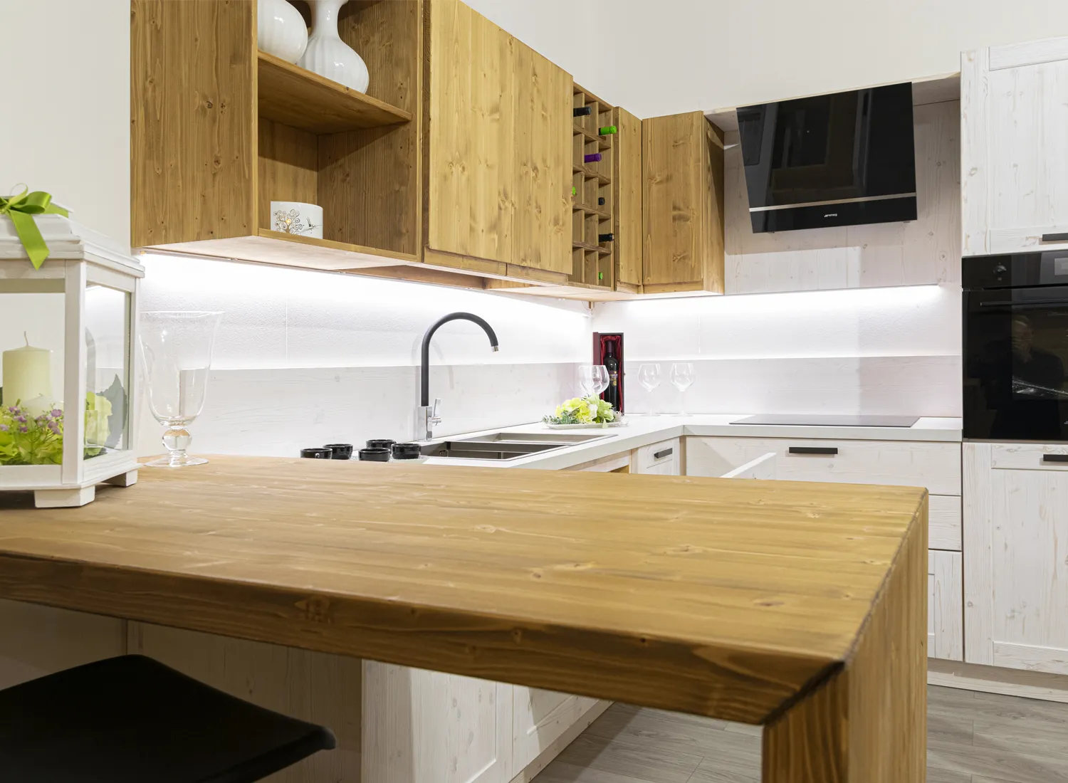 Le varie colorazioni, le tipologie, e i numerosi modelli di cucina in abete massello permettono di creare fantastici giochi di linee e di luce, che si integrano perfettamente con le composizioni create.