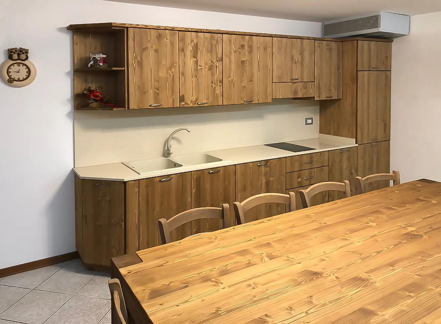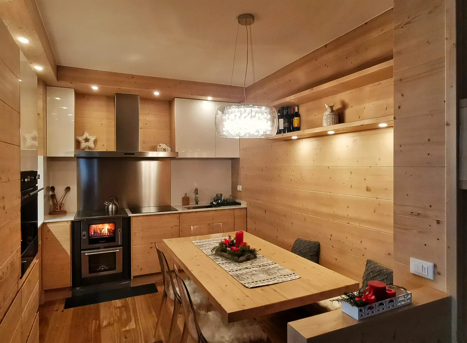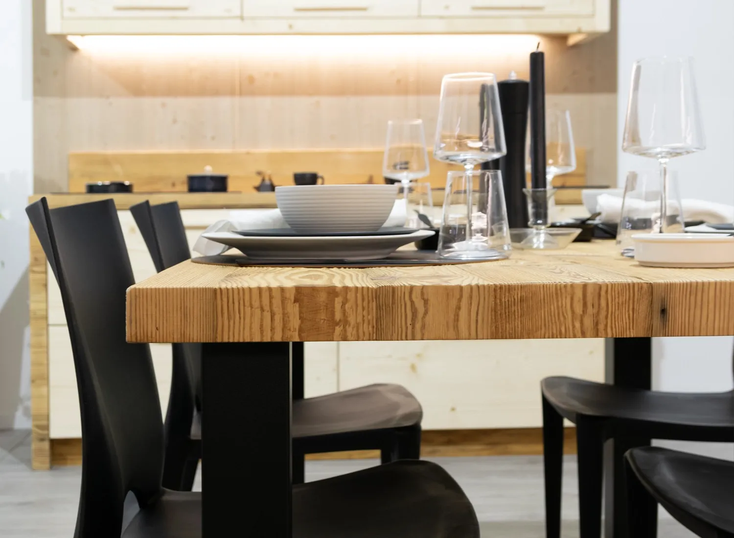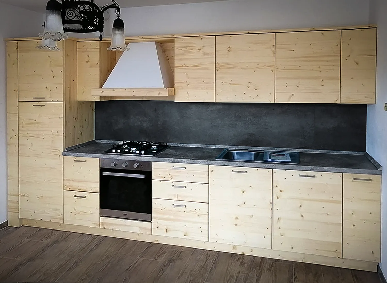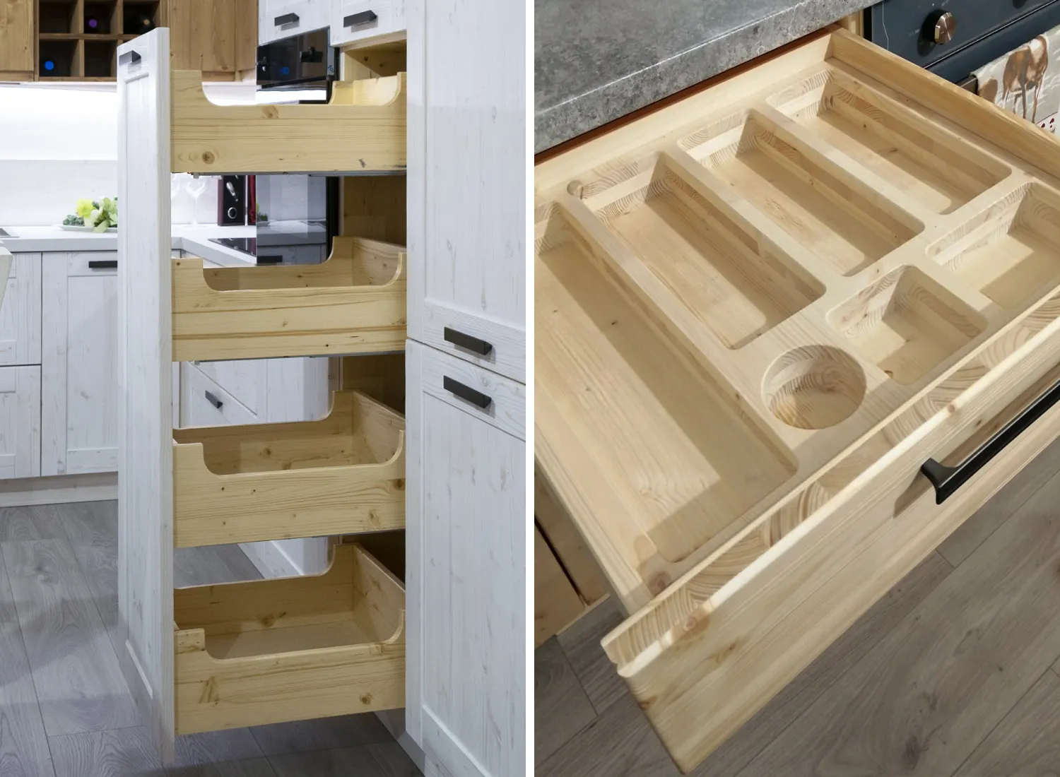 Le varie colorazioni, le tipologie, e i numerosi modelli di cucina in abete massello permettono di creare fantastici giochi di linee e di luce, che si integrano perfettamente con le composizioni create.