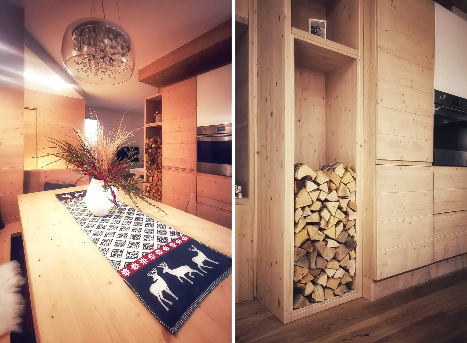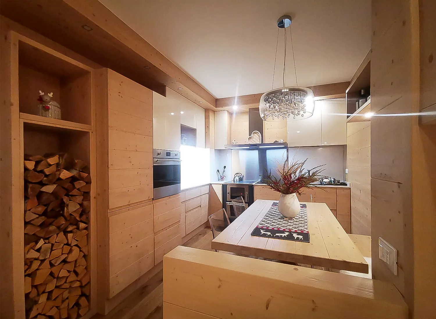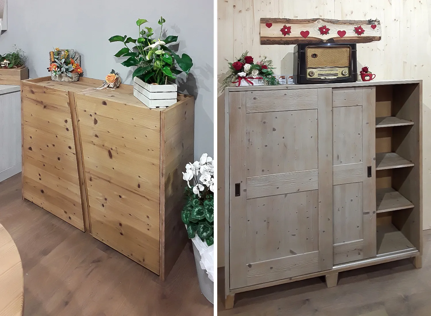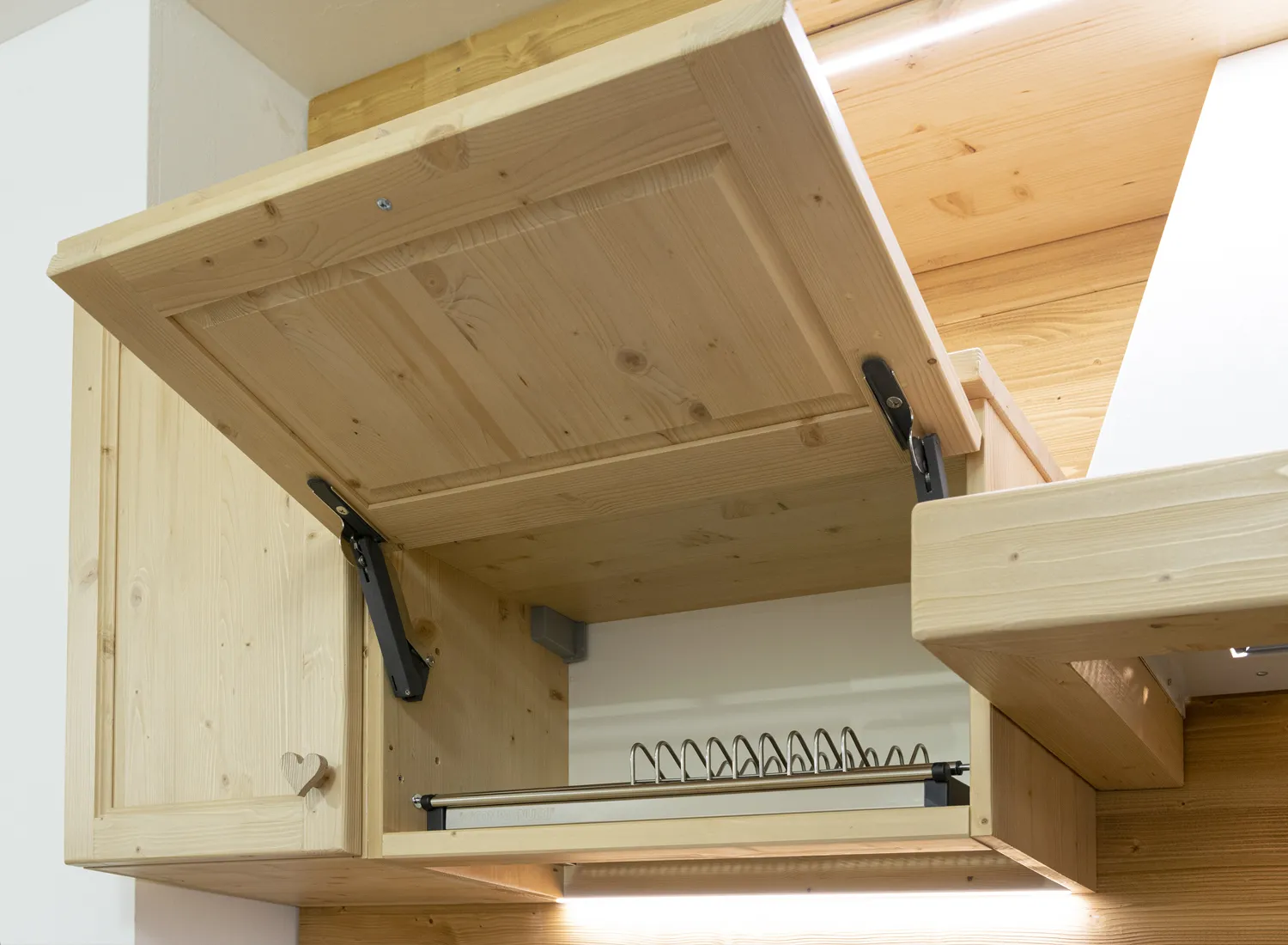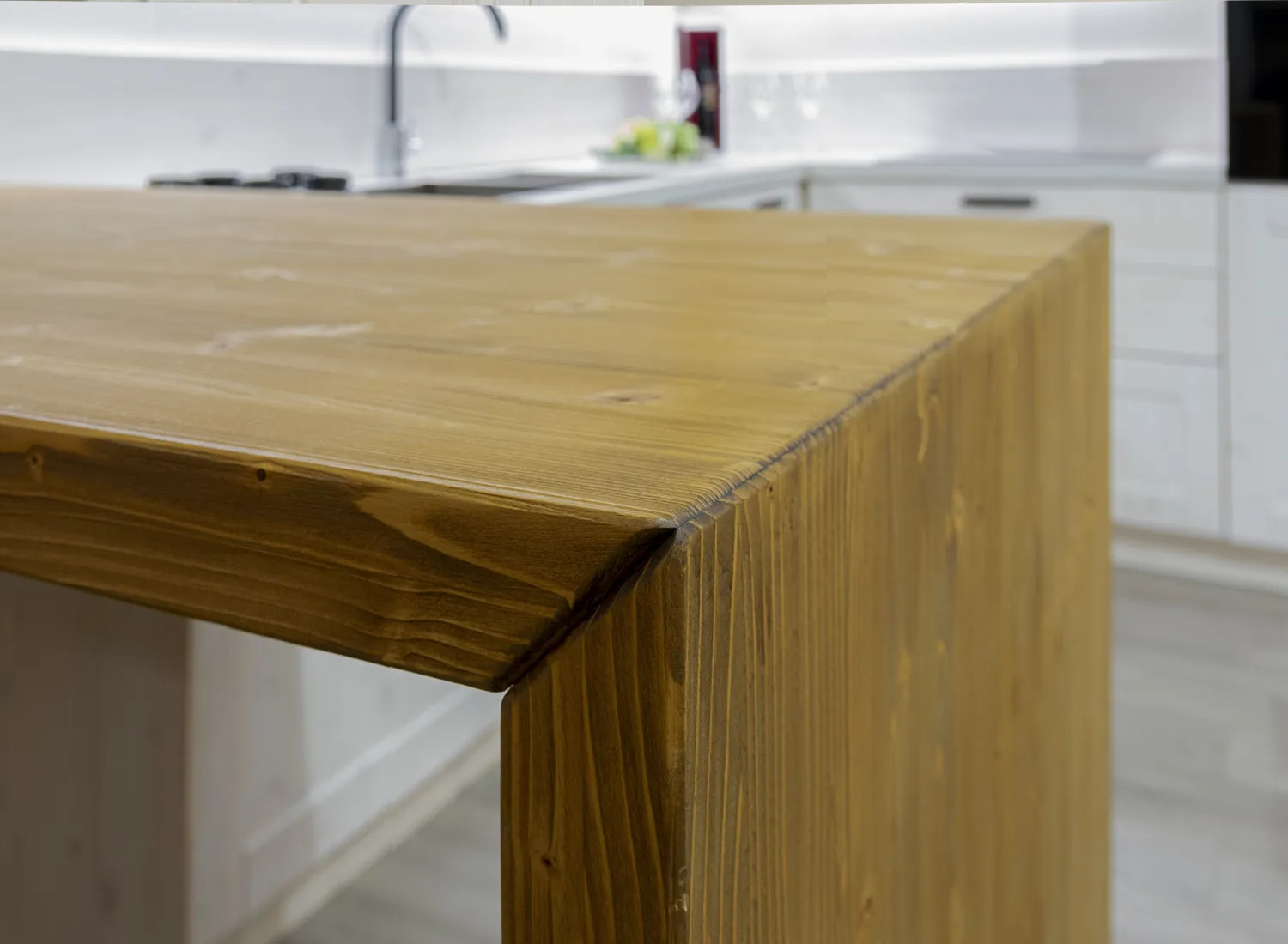 Le varie colorazioni, le tipologie, e i numerosi modelli di cucina in abete massello permettono di creare fantastici giochi di linee e di luce, che si integrano perfettamente con le composizioni create.