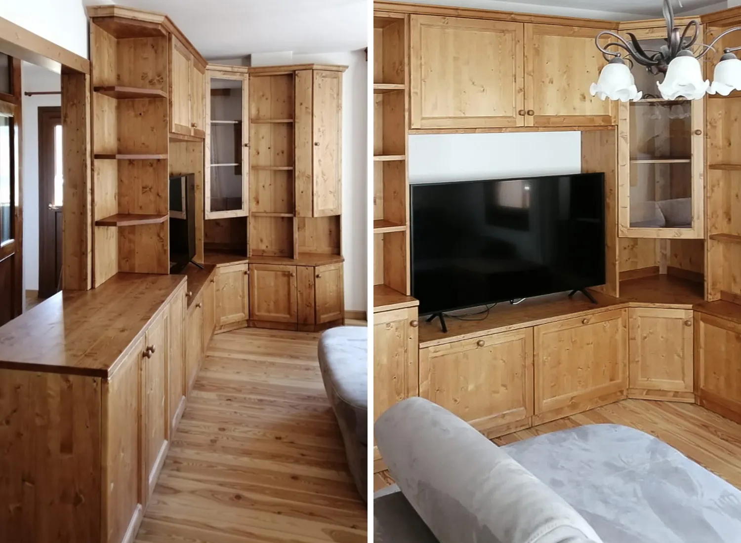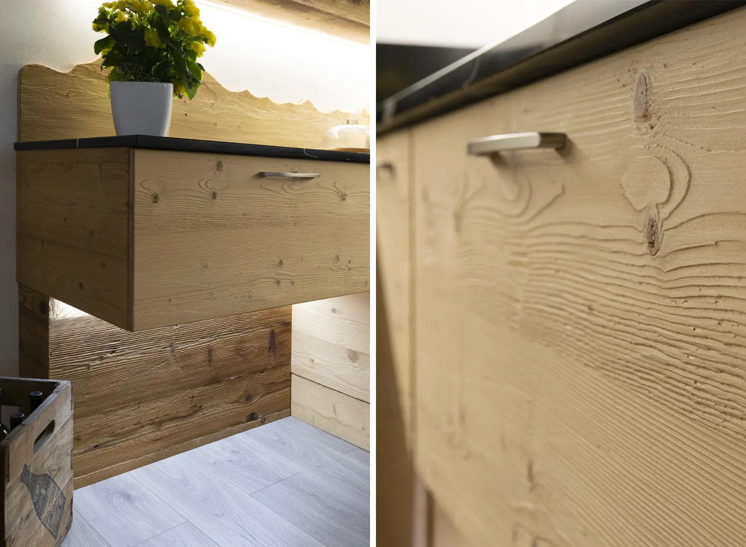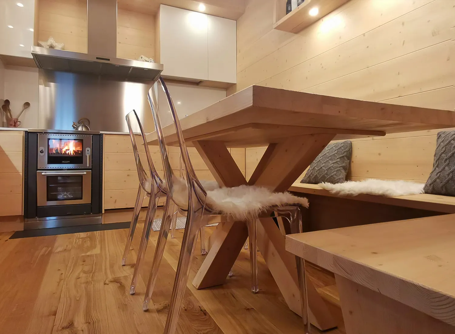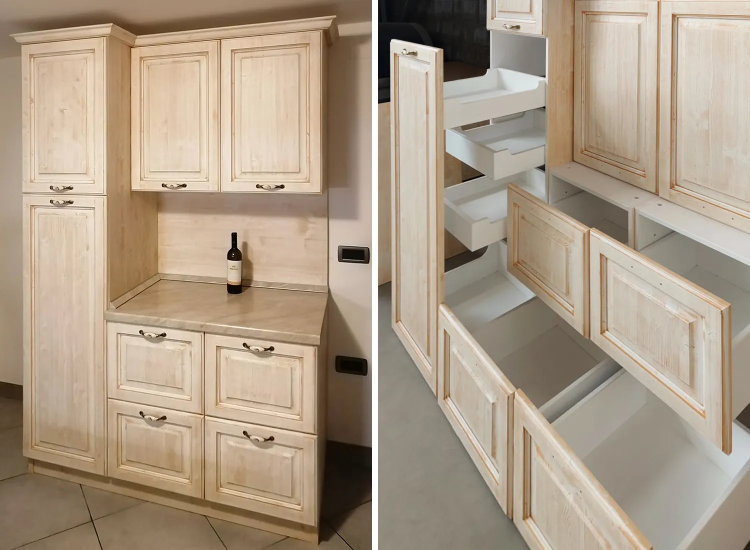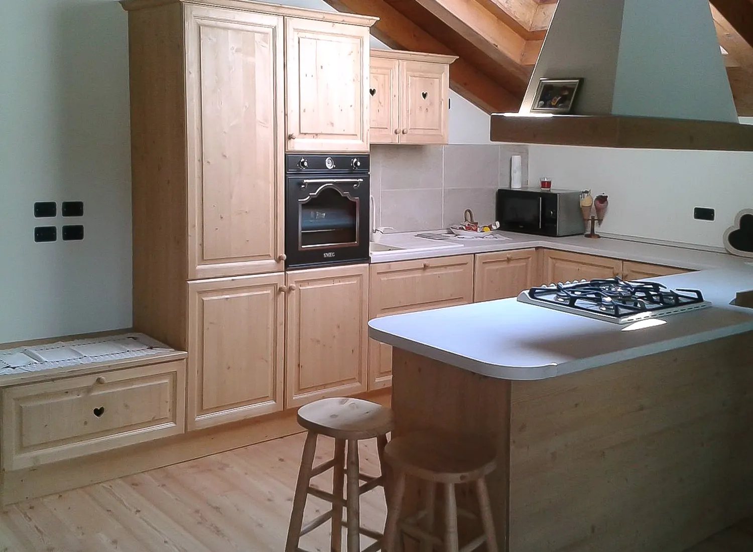 Le varie colorazioni, le tipologie, e i numerosi modelli di cucina in abete massello permettono di creare fantastici giochi di linee e di luce, che si integrano perfettamente con le composizioni create.